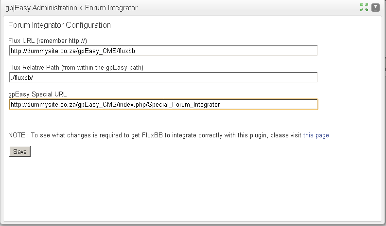 Last is the gpEasy  Special URL. This is the URL that is used inside gpEasy to display the forum. You can get this if you go to Plugins -> Forum Integrator -> Special Forum Integrator (Or the name you have given it if changed)
